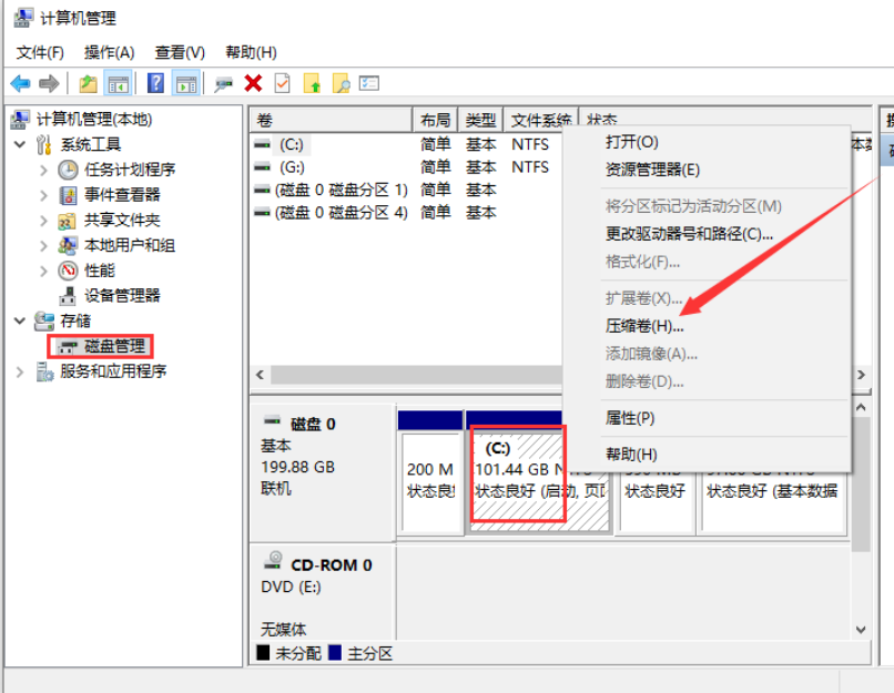 第三步:點擊側邊【磁盤管理】,在C盤右鍵,選擇【壓縮卷】。