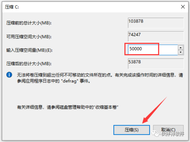 第四步:輸入你需要建立分區的大小,本例為50G,建議D盤分區為150G左右(一般用于安裝軟件的分區),然后點擊【壓縮】。C盤一般建議保留150-200G左右,其它分區按需求調整大小。