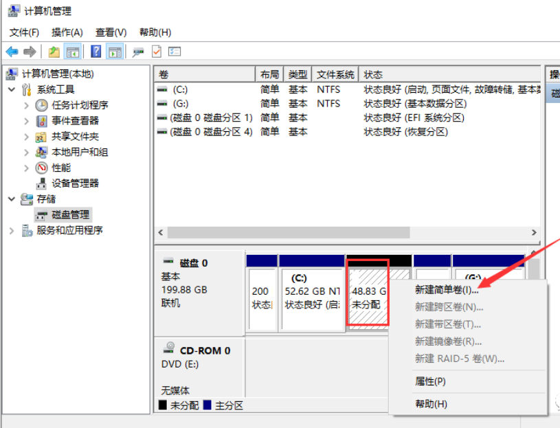 第五步:在未分配磁盤上右鍵,選擇【新建簡單卷】。